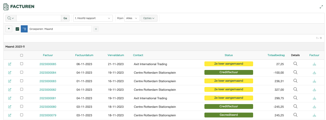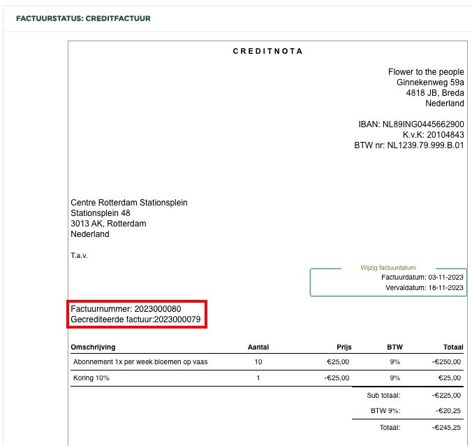 We zien in de overzicht factuur 2023000080, welke de creditering is van factuur 2023000079, welke ten onrechte was gecreëerd.