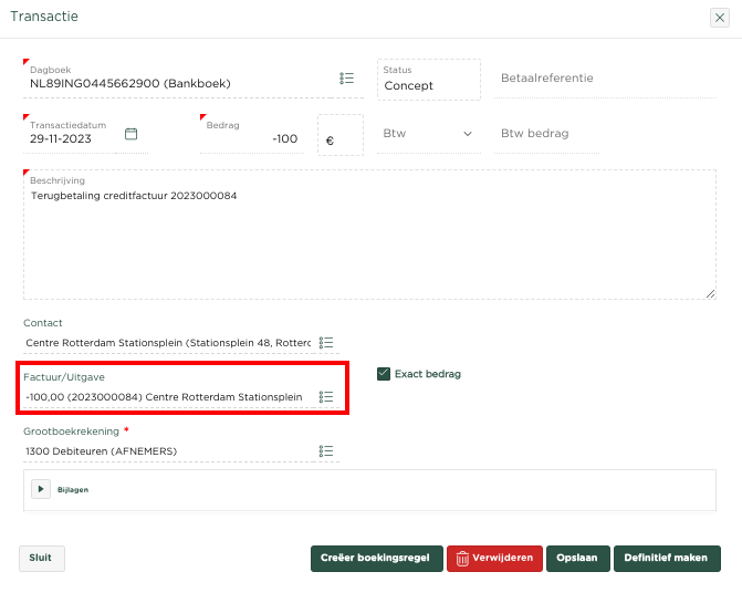 We hebben nu het betreffende bedrag van €100.00 terug overgeboekt op de rekening van de klant en verwerken de volgende banktransactie: