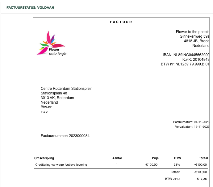 Factuur 2023000084 is met een negatief bedrag gecreëerd en naar de klant gestuurd.