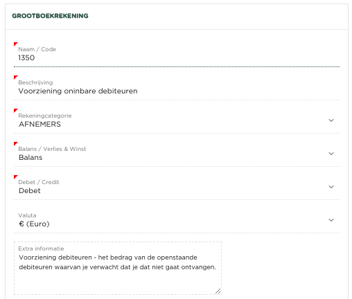 Zorg voor de aanwezigheid van een grootboekrekening, waarop de afschrijving van oninbare factuur kan worden geboekt. In het volgende voorbeeld gaan we uit van een Nederlands rekeningstelsel en hebben we rekening 1350 - Voorziening oninbare debiteuren gecreëerd als Balans rekening.
