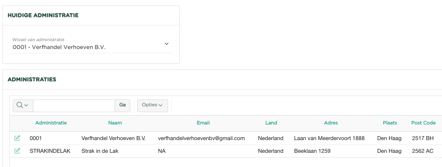 Indien er meerdere administratie beschikbaar zijn, kun je daar als gebruiker gebruik van maken, mits je hiertoe bent geautoriseerd.