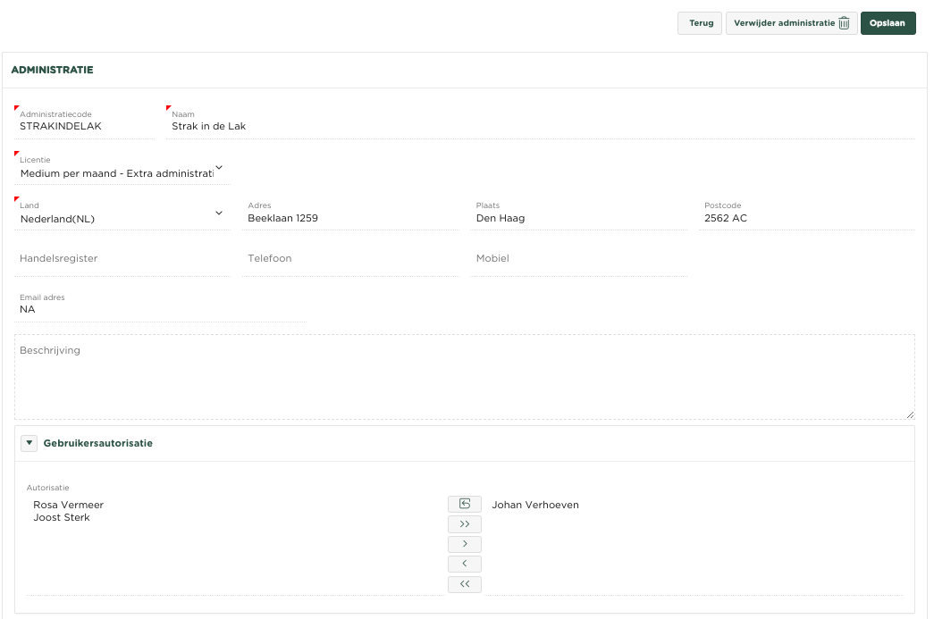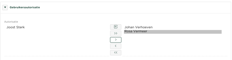 Aan de onderzijde van de pagina vind je onder Gebruikers autorisatie, aan de linker zijde de gebruikers welke nog niet geautoriseerd zijn voor deze administratie en aan de rechterzijde de gebruikers welke geautoriseerd zijn (Johan Verhoeven in dit voorbeeld)