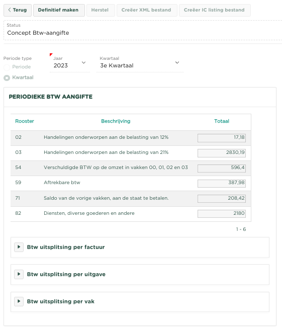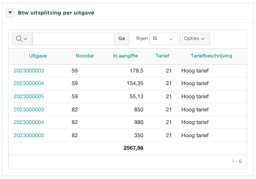), wordt een overzicht getoond van alle uitgaven welke zijn opgenomen binnen de betreffende Btw-aangifte.