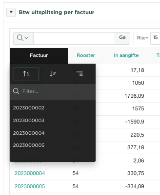Onder Filter, kun je nu een enkele factuur selecteren, of door op een van de 2 pijltjes te drukken, kan het inzicht oplopend (zoals in het voorbeeld), of aflopend worden gesorteerd.