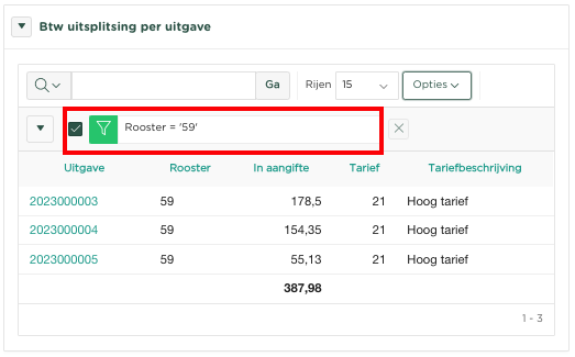 Evenals is beschreven onder Btw uitsplitsing per factuur, kan dit inzicht worden gedownload en kunnen uitgaven worden gefilterd door gebruik te maken van het filter op ieder van de kolommen. Het volgende voorbeeld toont het filteren van alle uitgaven binnen Rooster (Vak) 59.