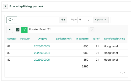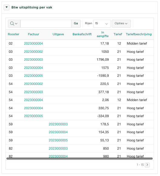 Door dit inzicht te openen (klik op ), wordt een overzicht getoond van alle roosters (vakken), met daarin alle facturen, uitgaven, bankafschriften, welke zijn opgenomen binnen de betreffende Btw-aangifte.