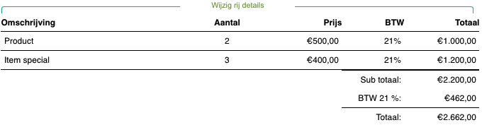 Binnen dit kader kunnen de kopteksten welke boven de diverse kolommen worden geplaatst worden gewijzigd:Koptekst Item, Koptekst Nummer, Koptekst Stukprijs, Koptekst BTW, Koptekst Bedrijf, Subtotaal, Totaal en Koptekst Totaal bedrag