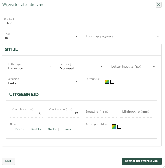 Binnen ieder van de kaders kunnen in ieder geval de volgende eigenschappen worden gewijzigd: Lettertype,Lettertype hoogte(px) en de Uitlijning van de tekst (Links, Midden of Rechts)
