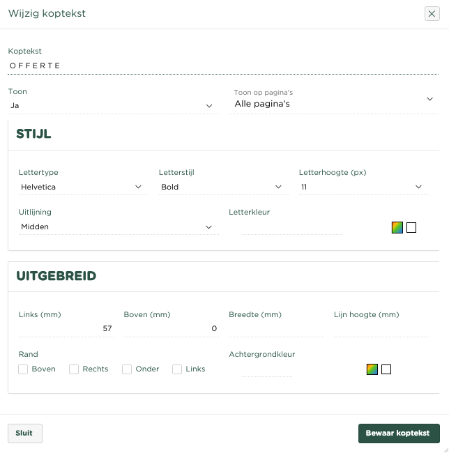 Door dit kader te selecteren kunt je de inhoud van de koptekst wijzigen