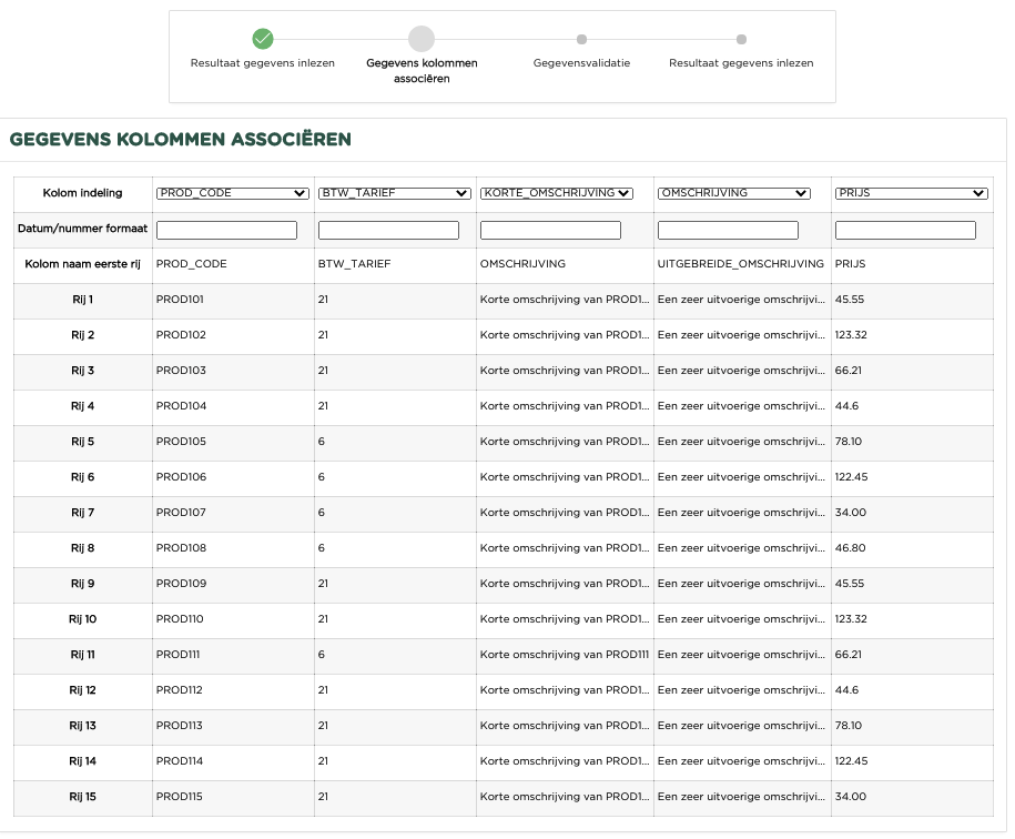 Vervolgens moet de kolom indeling worden uitgevoerd door boven iedere kolom de juiste kolomnaam te selecteren, zoals het voorbeeld laat zien.