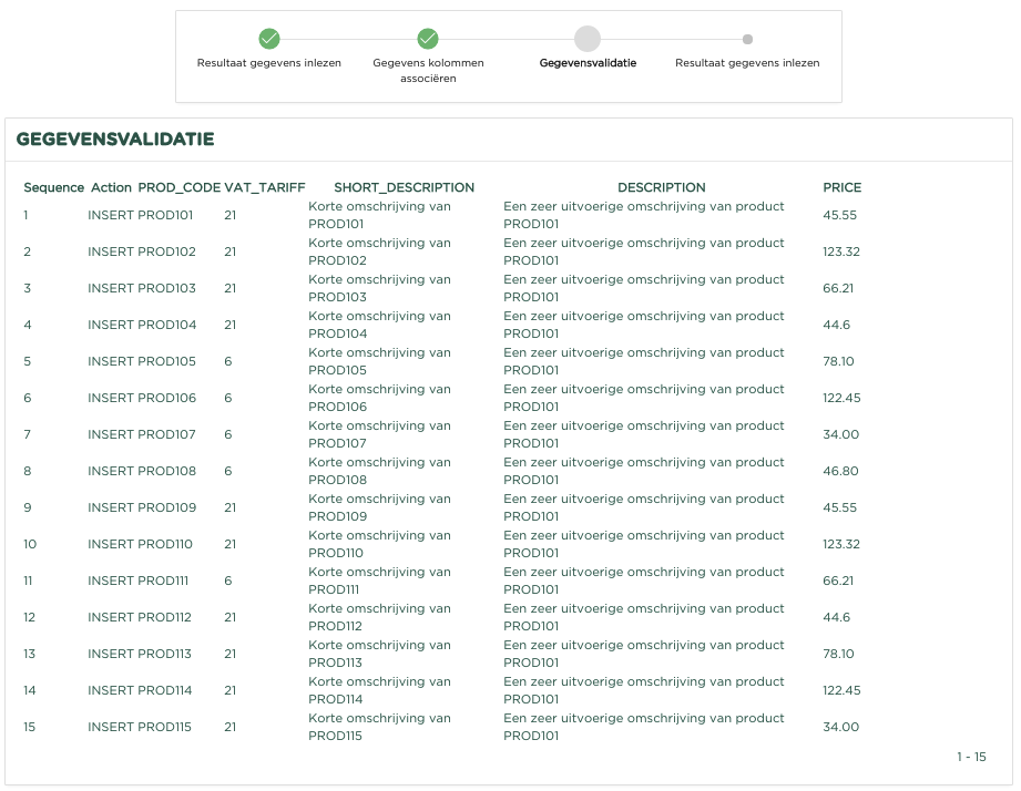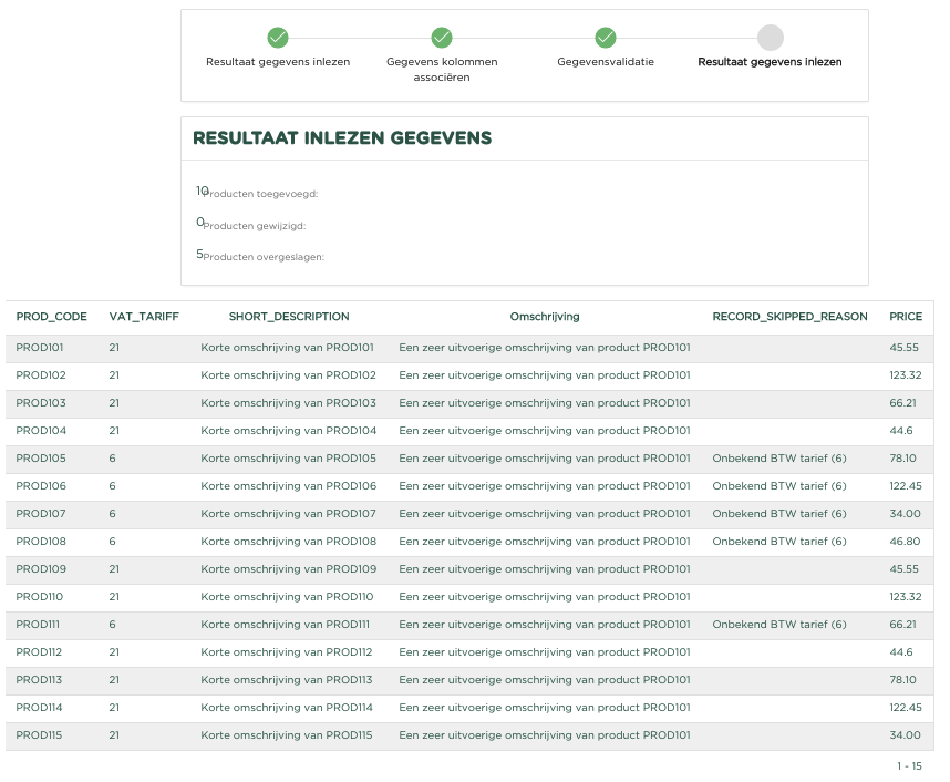 De producten worden nu allemaal ingelezen en zullen in de administratie worden opgenomen. Indien er producten in het bestand worden aangeboden, welke al in de administratie aanwezig zijn, zullen deze met de gegevens vanuit het bestand worden gewijzigd. Dit betekent eveneens dat op deze wijze dus bijvoorbeeld wijzigingen in omschrijving en/of prijs kunnen worden doorgevoerd.