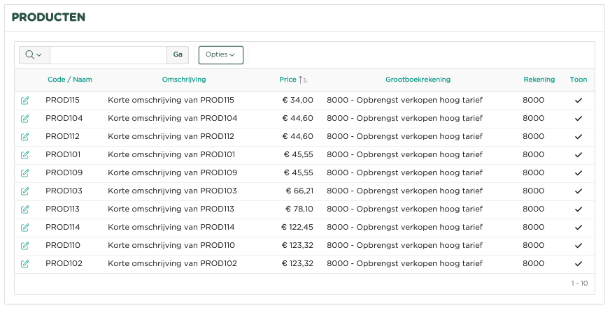 Het volgende voorbeeld toont de binnen de administratie ingelezen producten.