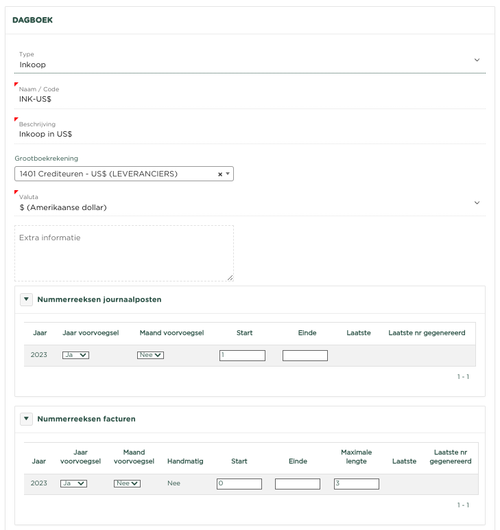 Selecteer via menuoptie Diverse - Dagboeken en voer het Dagboek in waarin transacties in de US$ moeten worden geboekt, zie het volgende voorbeeld: