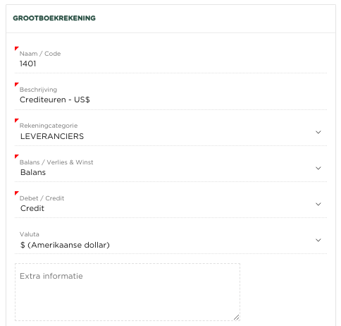 Selecteer via menuoptie Diverse - Grootboekrekeningen en voer de grootboekrekening in waarop leveranties in de US$ moeten worden geboekt, zie het volgende voorbeeld: