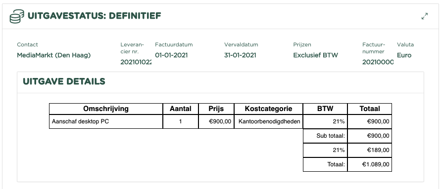 Deze boeking vind plaats op het moment dat je de Inkoopfactuur voor de Computer als Uitgave hebt ingevoerd en ‘Definitief’ gemaakt.