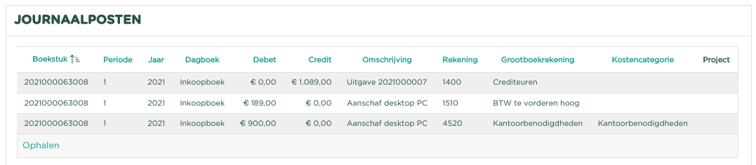 | | Debet | Credit | | | -------------------------------------- | ---------- | ----------- | | 0135 - Computers | €900,- | | | 1600 - Te vorderen omzetbelasting | €189,- | | | 1700 - Aan Crediteuren | | €1089,- |