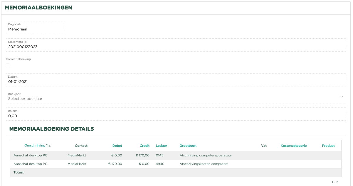 | | Debet | Credit | | | -------------------------------------- | ---------- | ---------- | | 4335 - Afschrijvingskosten | €170,- | | | 0140 - Aan Afschrijving computers | | €170,- |