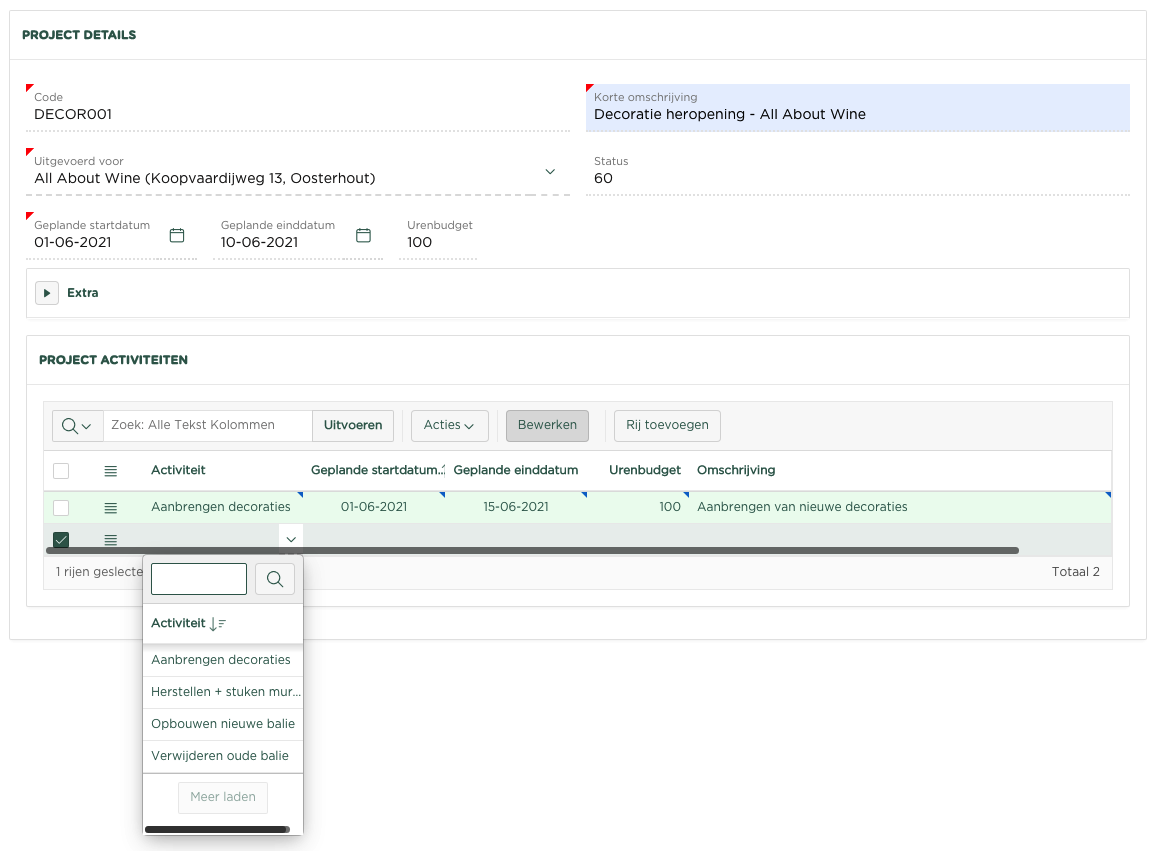 Alvorens je begint met het vastleggen van een nieuw project, is het verstandig om eerst de activiteiten in te voeren (als je dit nog niet gedaan hebt), welke je voor het nieuwe project moet gaan uitvoeren.