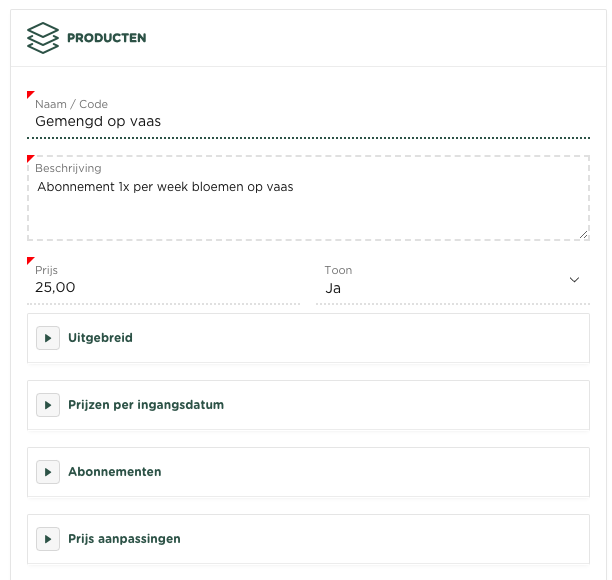 kan een abonnementstype worden toegewezen. Hiermee wordt aangegeven dat het product een abonnement betreft en kan worden aangegeven of het een ‘Wekelijks‘, ‘Maandelijks‘, ‘Kwartaal‘, ‘1/2 jaarlijks‘ of ‘Jaarlijks‘ abonnement betreft.