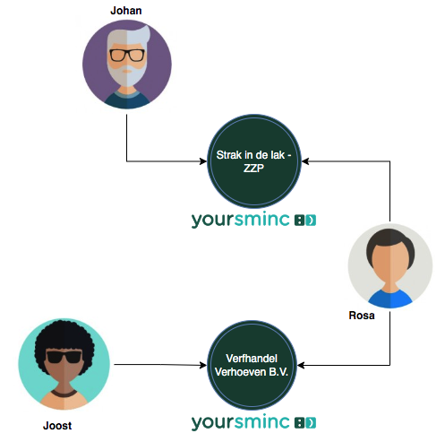 Het plaatje toont een voorbeeld van meerdere administraties, waarbij er sprake is van een 2-tal bedrijven: Strak in de lak, waarin zelfstandig ondernemer Johan, schilderwerkzaamheden uitvoert voor bedrijven en particulieren en de winkel Verfhandel Verhoeven B.V. waar Joost Sterk werkzaam is in de winkel.