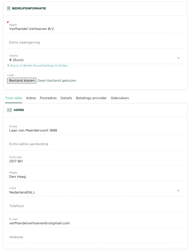 Getoond wordt de Bedrijfsinformatie pagina voor de hoofdadministratie