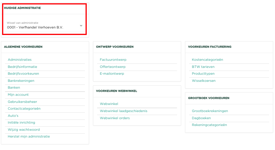 Wie zien hier linksboven op de pagina aangegeven dat de huidige administratie "0001 - Verhandel Verhoeven BV" is. Deze naam is automatisch gecreëerd op het moment dat er een registratie werd gedaan voor het gebruik van het pakket. Aangezien er nog geen andere administraties zijn gecreëerd, is dit nu de enige administratie binnen de lijst.