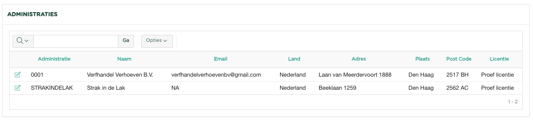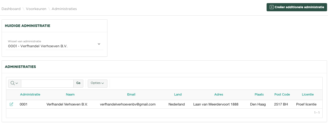 Nadat de nieuwe administratie succesvol is gecreëerd, wordt deze in de Administraties pagina getoond.