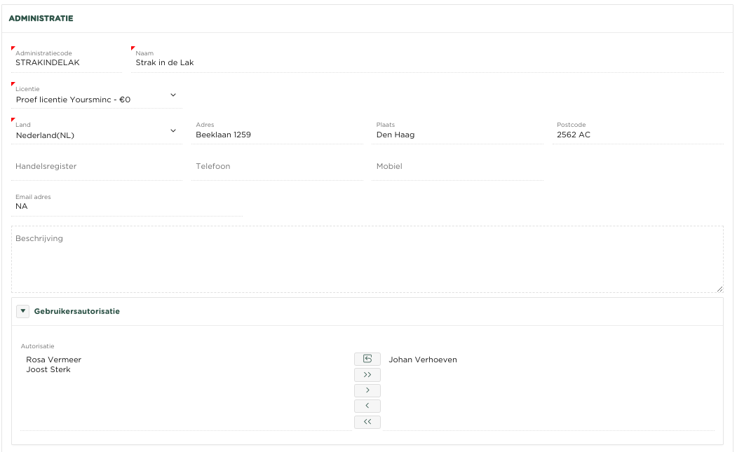 Merk tevens op dat we gebruiker Johan Verhoeven hebben geautoriseerd door deze met de knop naar rechts te verplaatsen. Hiermee hebben we nu gelijk ook Johan Verhoeven geautoriseerd voor toegang tot zijn eigen administratie.