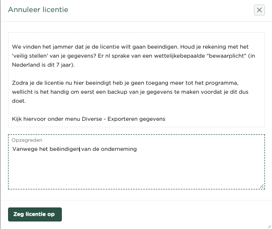 Lees goed de notitie welke wordt getoond en type een reden waarop je de licentie wilt opzeggen. We vragen je dit, zodat wij hier wellicht weer van kunnen leren...
