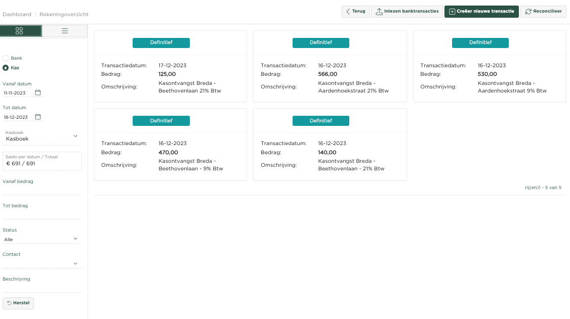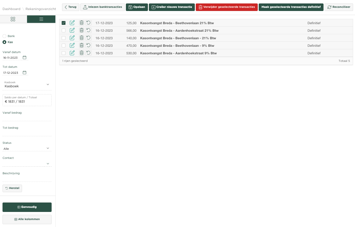 Deze pagina toont transacties binnen het kasboek, welke aan de linkerzijde van de pagina is geselecteerd, binnen een datumreeks eveneens aan de linkerzijde van de pagina ingegeven