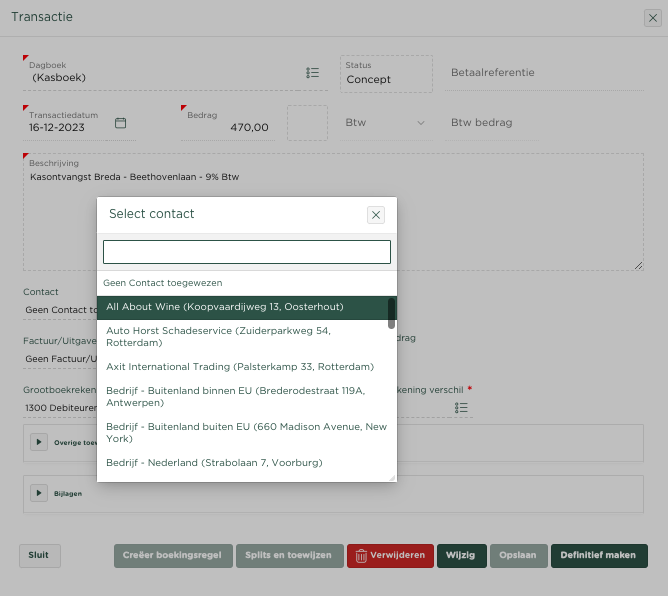 Het getoonde voorbeeld, laat zien dat we nu de mogelijkheid hebben om de transactie toe te wijzen aan een Factuur of Uitgave, dat we eventueel de omschrijving kunnen aanpassen, een Contact kunnen toewijzen en ook de Grootboekrekening waarop de transactie geboekt moet worden. Nadat de gewenste toewijzing is gedaan, kan de transactie worden verwerkt door op te