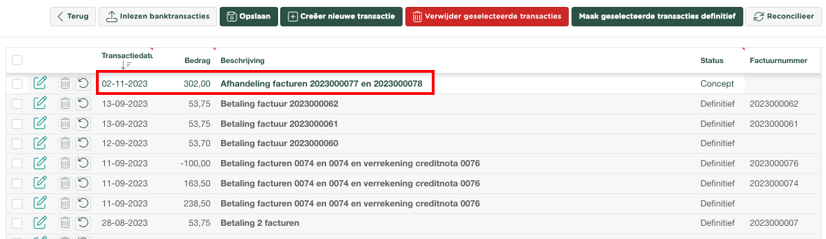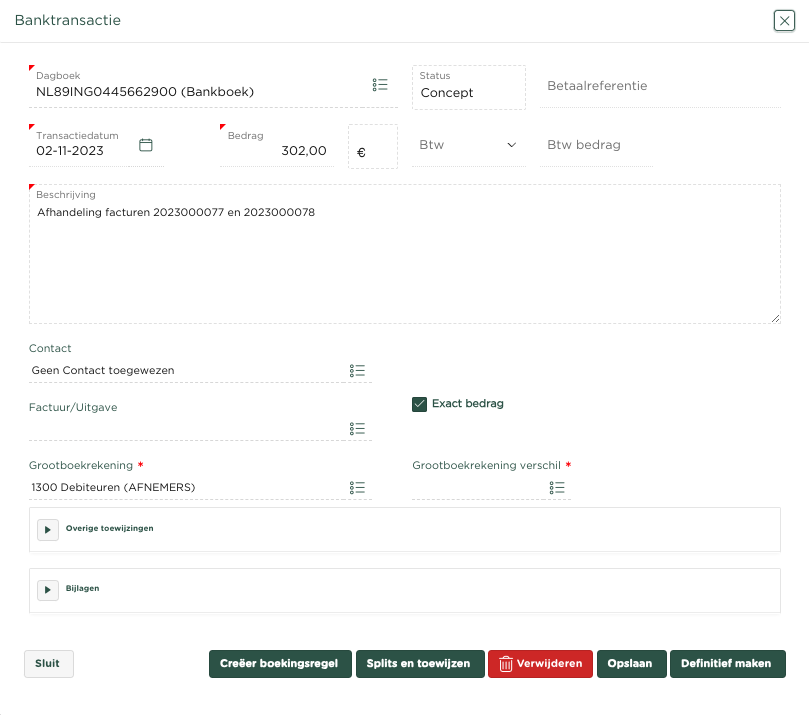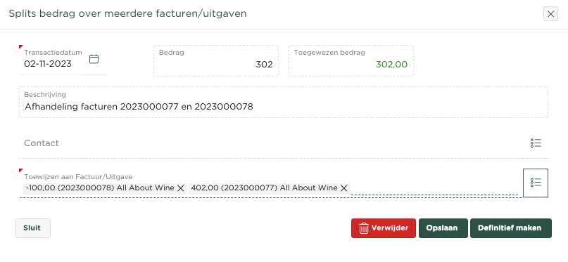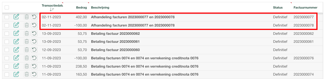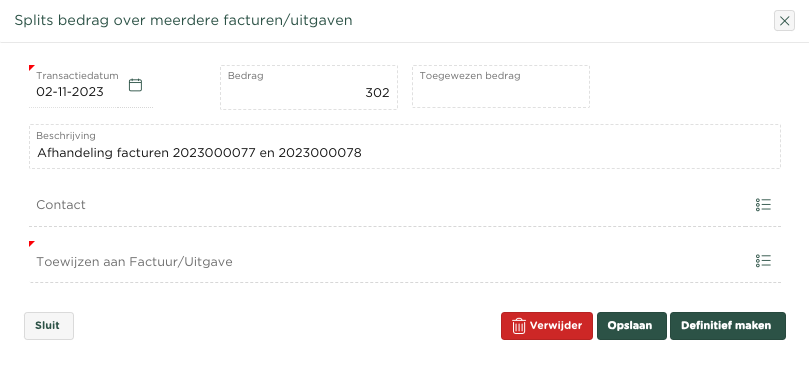 We zien nu dat de oorspronkelijke banktransactie met het bedrag van €302,- is gesplitst in een aparte transactie voor ieder van de toegewezen facturen.