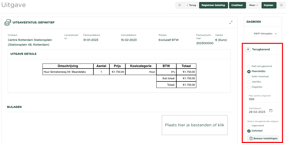 We voeren de factuur van de huur van ons bedrijfspand in en geven aan de rechterzijde van de pagina, onder Terugkerend, aan dat deze uitgave Maandelijks terugkerend is en dat de status van de gegenereerde factuur Definitief zou moeten zijn. Tevens dienen we een Startdatum in te geven, vanaf welke datum de eerst volgende factuur moet worden gegenereerd.