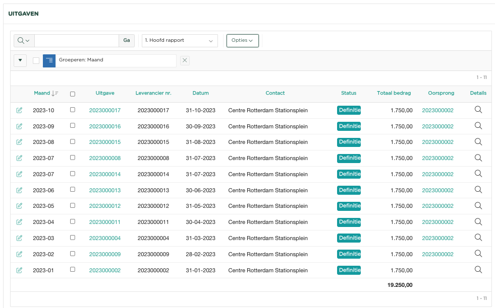 We zien in het overzicht (waar we hebben geselecteerd op het contact Centre Rotterdam Stationsplein, de oorspronkelijke Uitgave per 31/1/23 en vervolgens alle hierna maandelijks automatisch gecreëerde Uitgaven, met in de kolom Oorspronkelijke uitgave, een verwijzing naar de oorspronkelijke uitgave 2023000002.