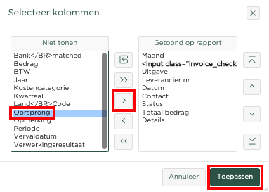 LET OP, we hebben de pagina Overzicht Uitgaven wel moeten aanpassen, daar de kolom Oorspronkelijk Uitgave hierin 'standaard' niet in is opgenomen. We beschrijven nu hoe je de betreffende kolom aan het overzicht kunt toevoegen.