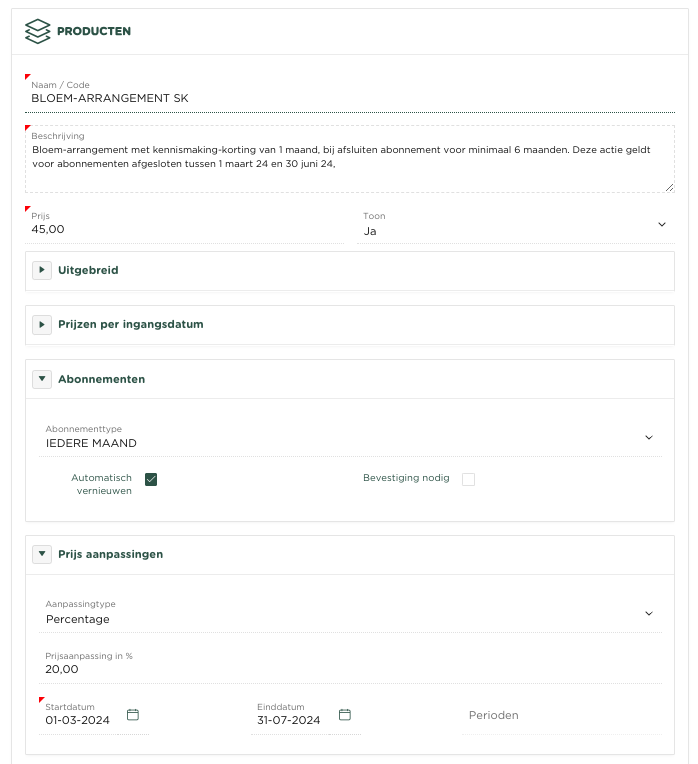 Het voorbeeld betreft een bloem-arrangement, waarvoor een korting geldt van 20% tijdens de periode 01-03-2024 / 31-07-2024