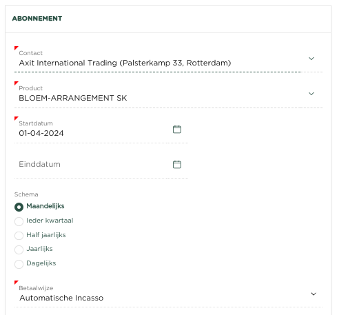 Het voorbeeld toont de toewijzing van het betreffende abonnement aan Contact Axit International Trading, met als ingangsdatum 01-04-2024 en betreft een maandelijks abonnement.