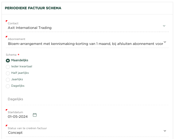 Bij de creatie van het Periodieke Factuur Schema, zijn zowel het Contact en het Abonnement geselecteerd en de startdatum. Tevens is aangegeven dat de factuur welke nu periodiek zal worden gecreëerd, de 'Concept' status zal hebben.