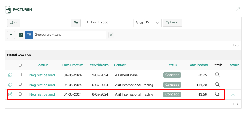 We zien nu in het facturen-overzicht dat er op 1 mei 24 een factuur concept is gecreëerd.