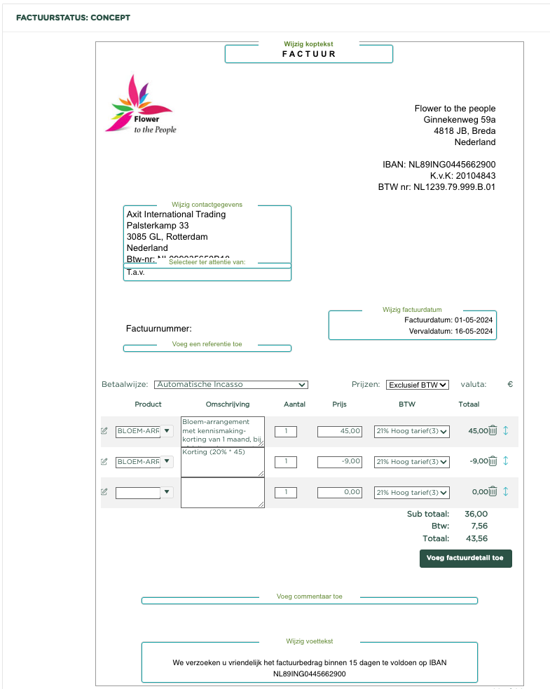 Als 2e factuurregel is de korting van 20% toegepast op de initiële prijs van €45,00.