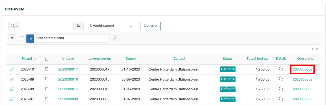 Selecteer uit de pagina Overzicht uitgaven de Oorsprong