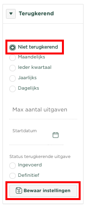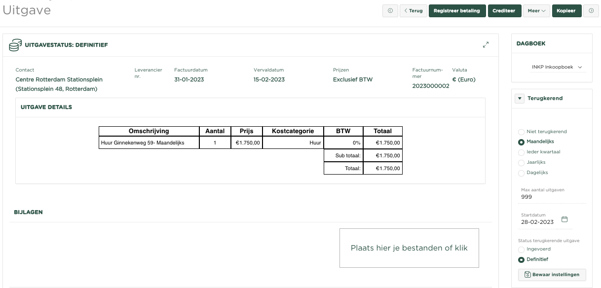 Stel je hebt voor een uitgave aangegeven dat deze Terugkerend is, bijvoorbeeld de factuur welke je ontvangt voor het incasseren van de huur voor een bedrijfsruimte. Successievelijk zullen nu automatisch de diverse uitgaven zijn gecreëerd.