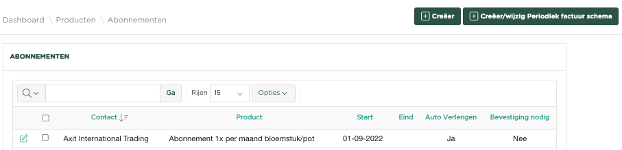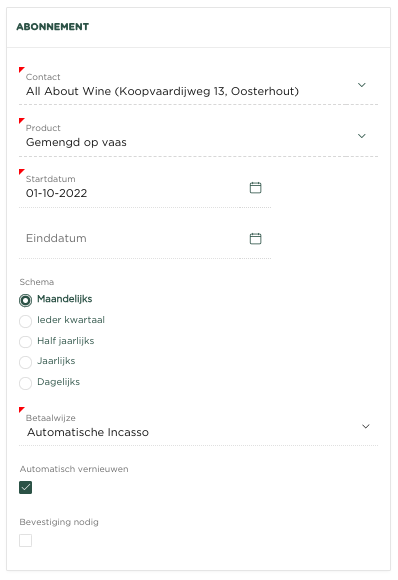 In dit voorbeeld zien we de creatie van een maandabonnement voor contact ‘All About Wine’ op een product ‘ Gemengd op vaas’. Het abonnement moet ingaan op 01-10-2022 en zal voor onbepaalde tijd duren.