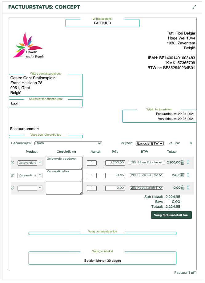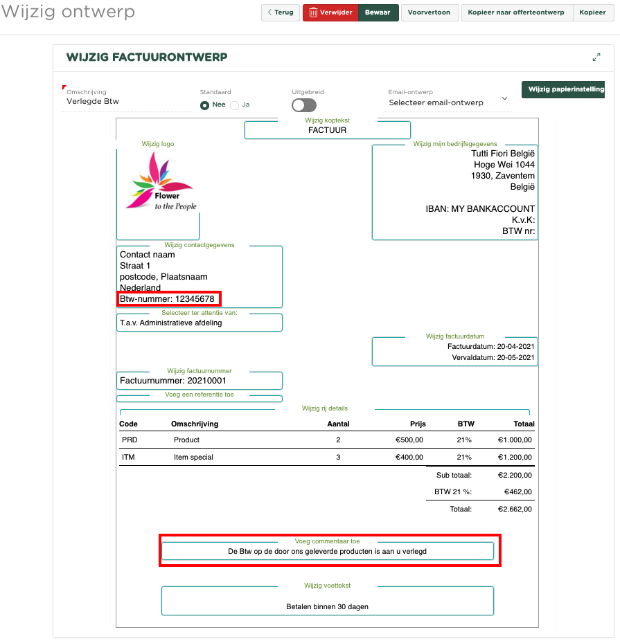 Het getoond ontwerp bevat de vermelding van het land van vestiging, plus het Btw-nummer van uw klant. De voettekst binnen het ontwerp bevat eveneens de vermelding dat er sprake is van verlegde Btw.