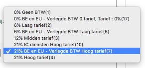 Bij het invoeren van de factuurdetails moeten we het te hanteren Btw-tarief selecteren, zie het volgende voorbeeld: