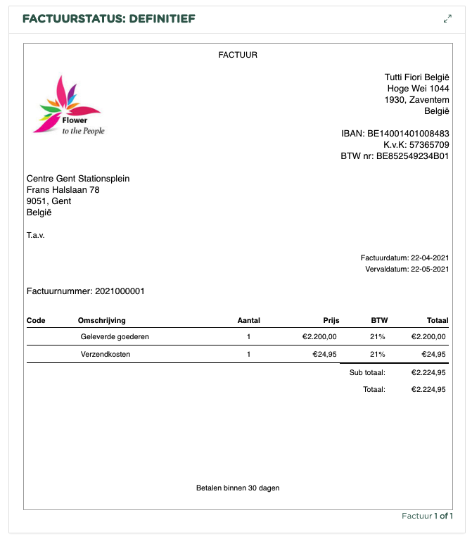 Het getoond voorbeeld laat zien dat het btw-bedrag €0,00 bedraagt. Op het moment dat de factuur nu ‘Definitief’ wordt gemaakt, toont de factuur eveneens de voettekstregel waarin wordt verwezen dat er sprake is van verlegde Btw.