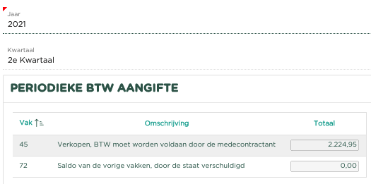 Kijken we nu naar hoe deze factuur is verwerkt binnen onze Btw-aangifte, dan zien we dat Vak 45 “Verkopen, BTW moet worden voldaan door de medecontractant” €2224,95 en Vak 72 “Saldo van de vorige vakken, door de staat verschuldigd” €0,00 bedraagt.
