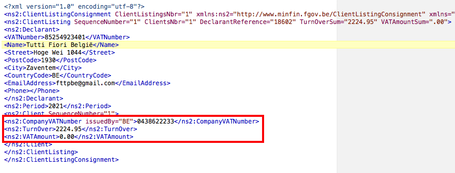 Het getoonde xml bestand bevat nu tevens de vermelding van het factuurbedrag – TurnOver – 2224,95 en het Btw-nummer van de betreffende debiteur (CompanyVATNumber IssuedBy)