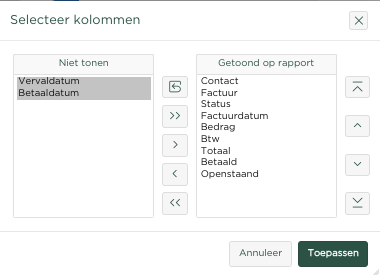 Gebruik deze dialoog, om kolommen getoond of niet getoond te krijgen en om kolommen in een andere volgorde te plaatsen. Druk tenslotte op om doorgevoerde wijzigingen te activeren.