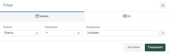 Gebruik deze dialoog, om kolommen of rijen te filteren op basis van een gekozen Operator en Expressie
